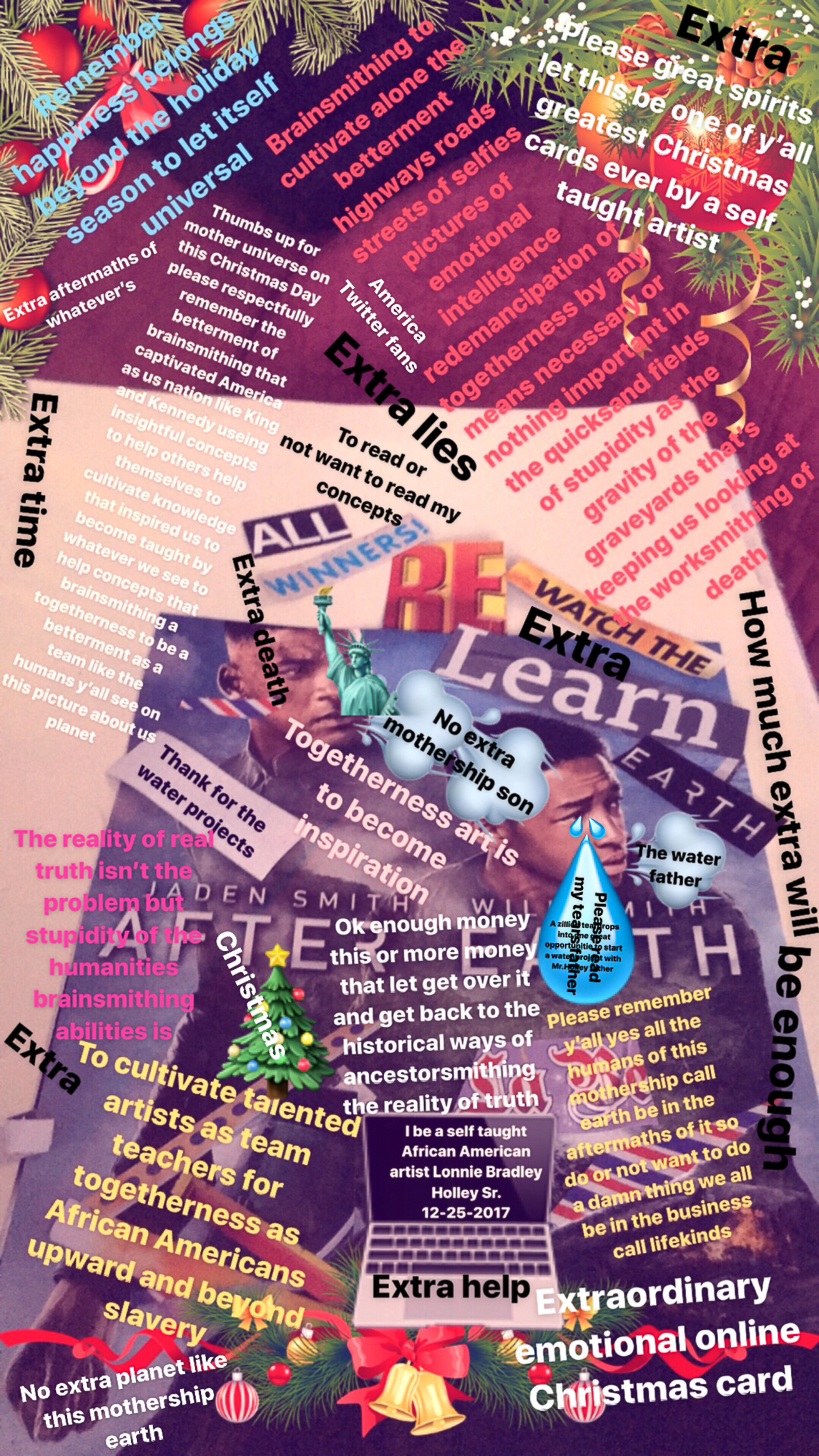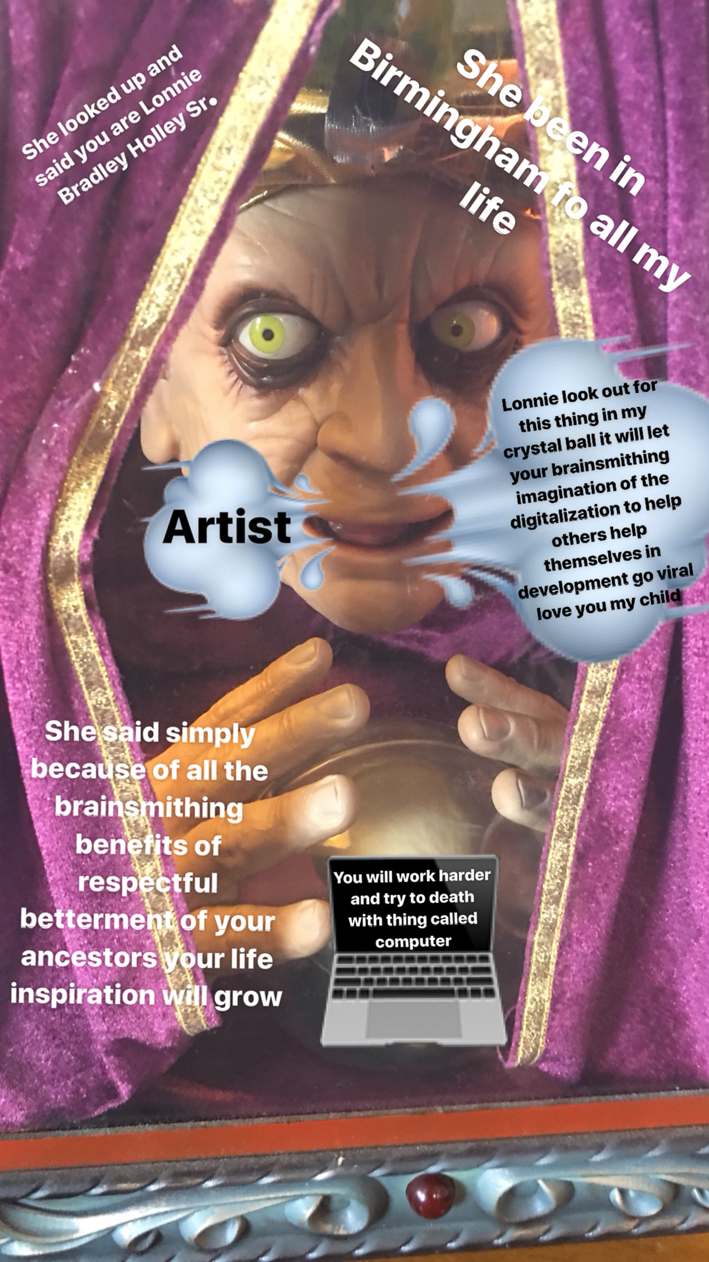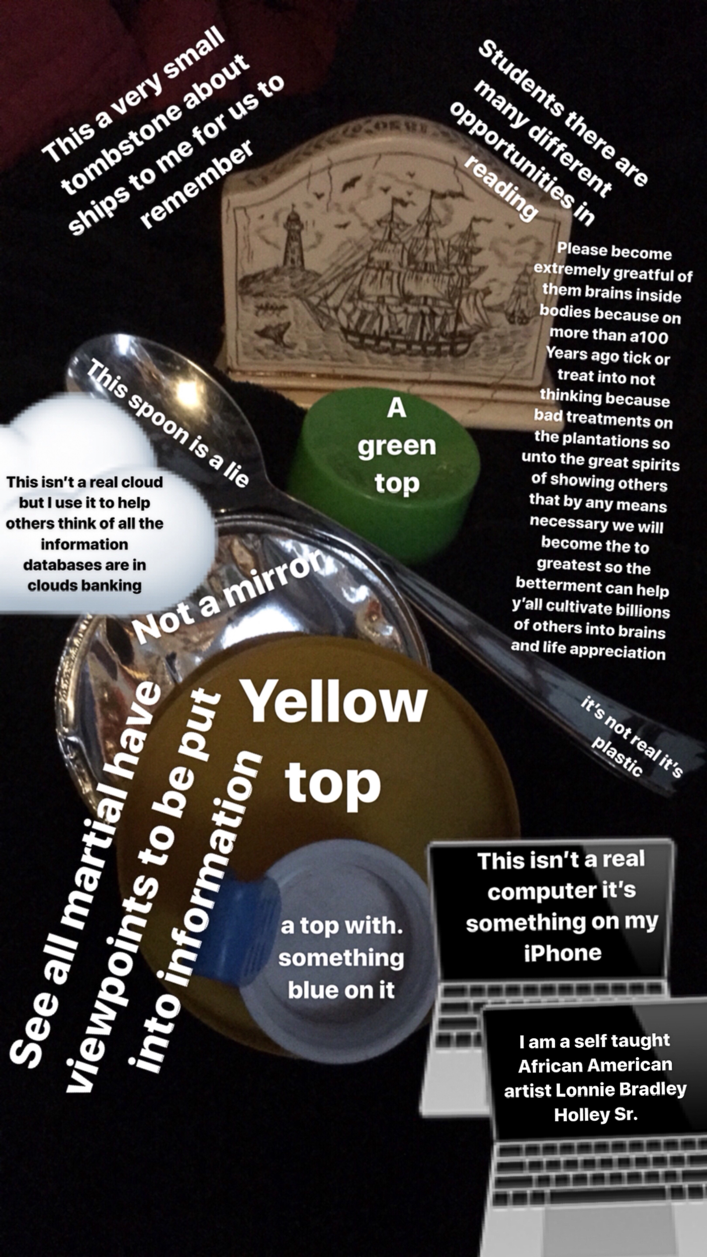 As collector William Arnett says in the film, “Lonnie Holley is a 24/7 art making machine.” When he is in a car or an airplane and other materials are not to hand, he uses his phone to photograph and create digital works which he posts to his personal Facebook page. One time I asked Lonnie to just empty his phone onto my desktop. Over 1,000 photographs, works-in-progress, graphic designs, and artworks came tumbling out.