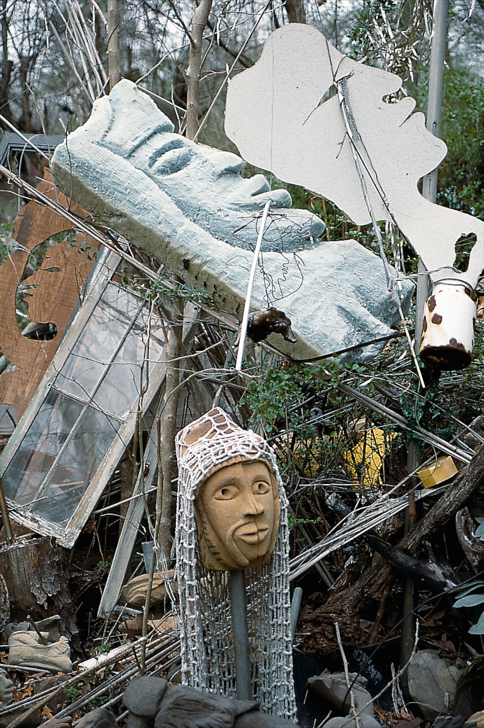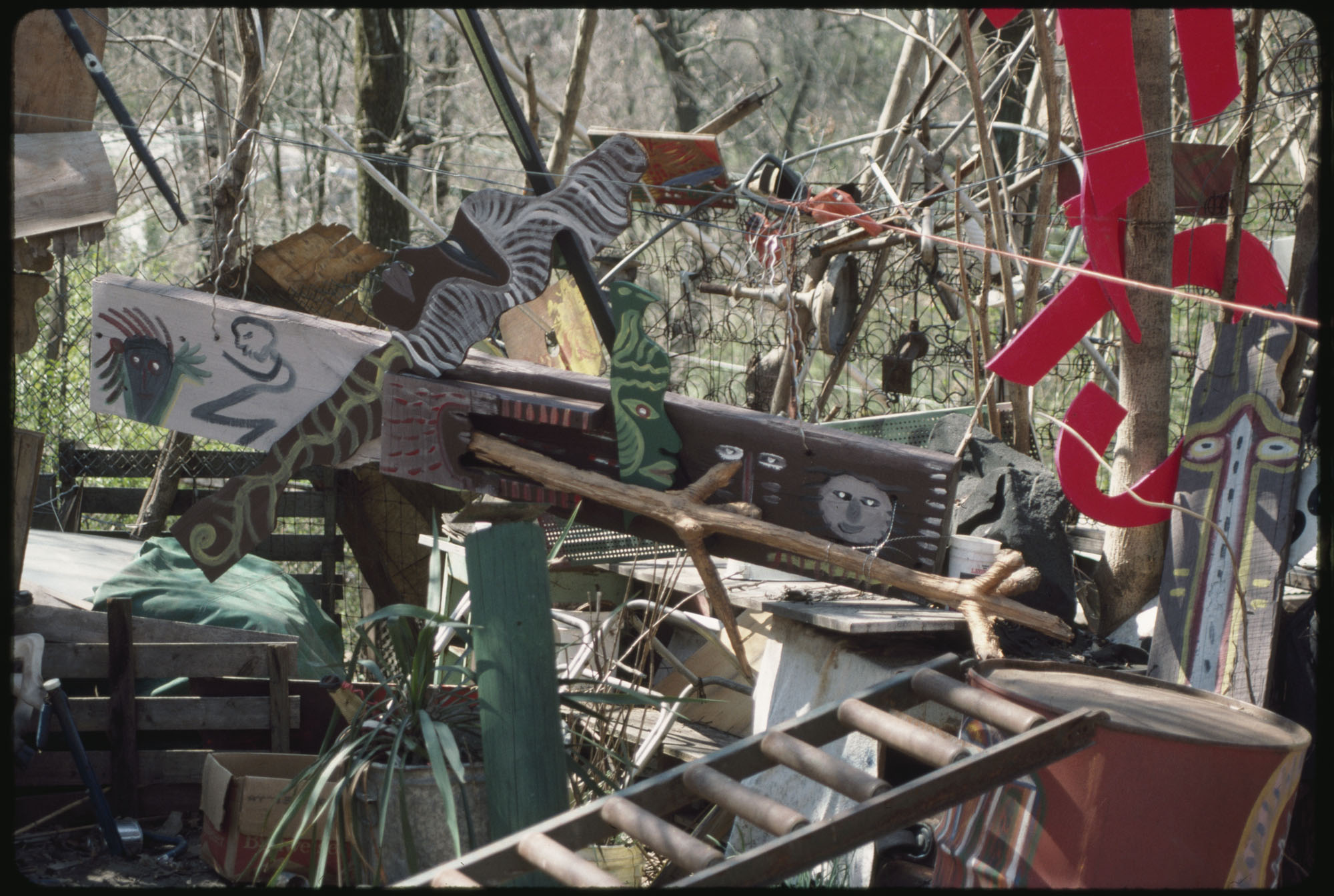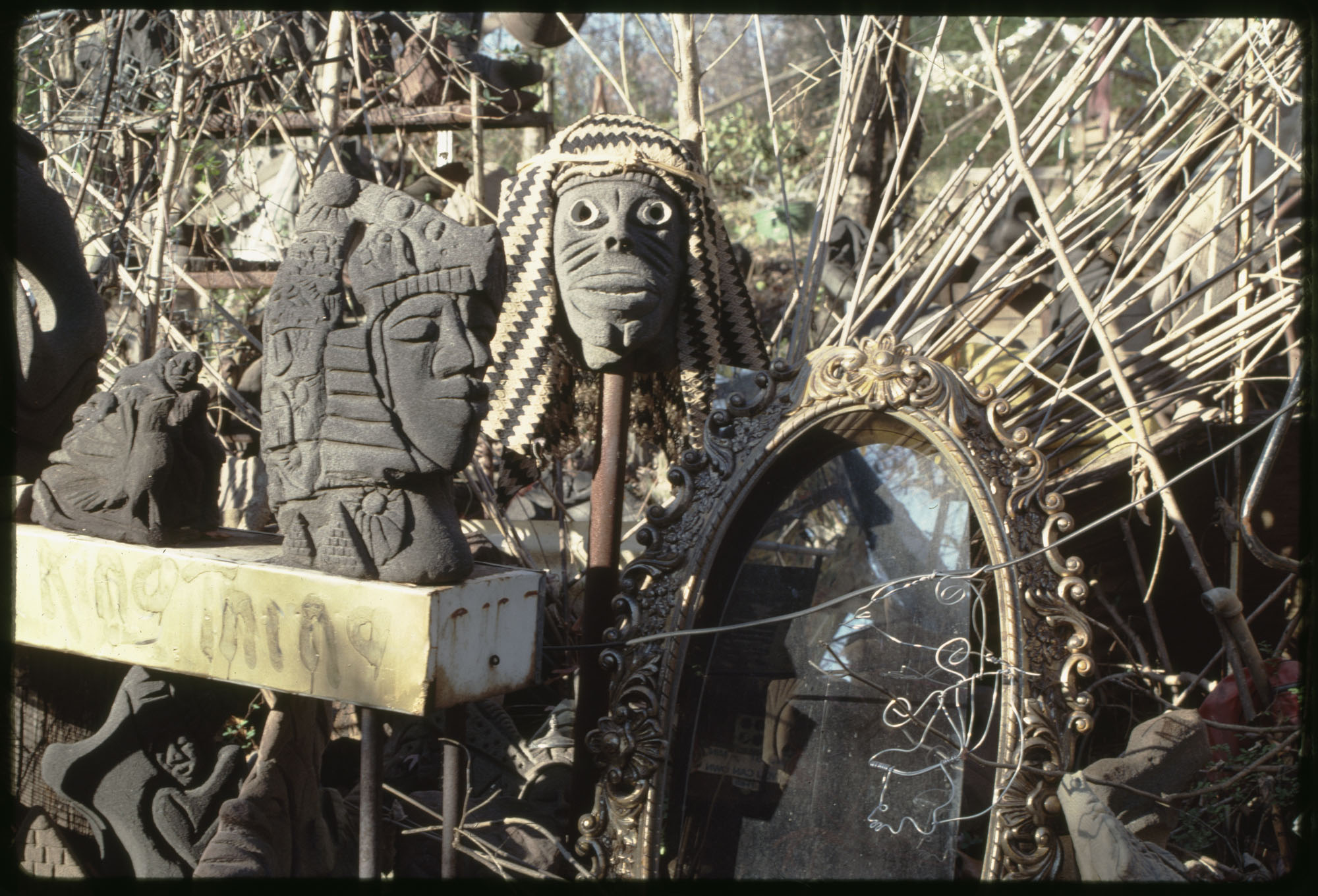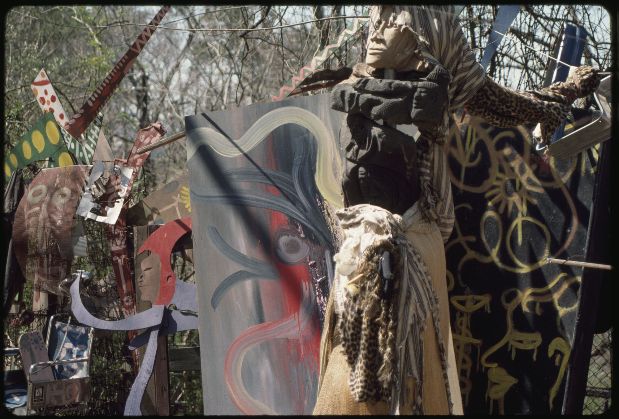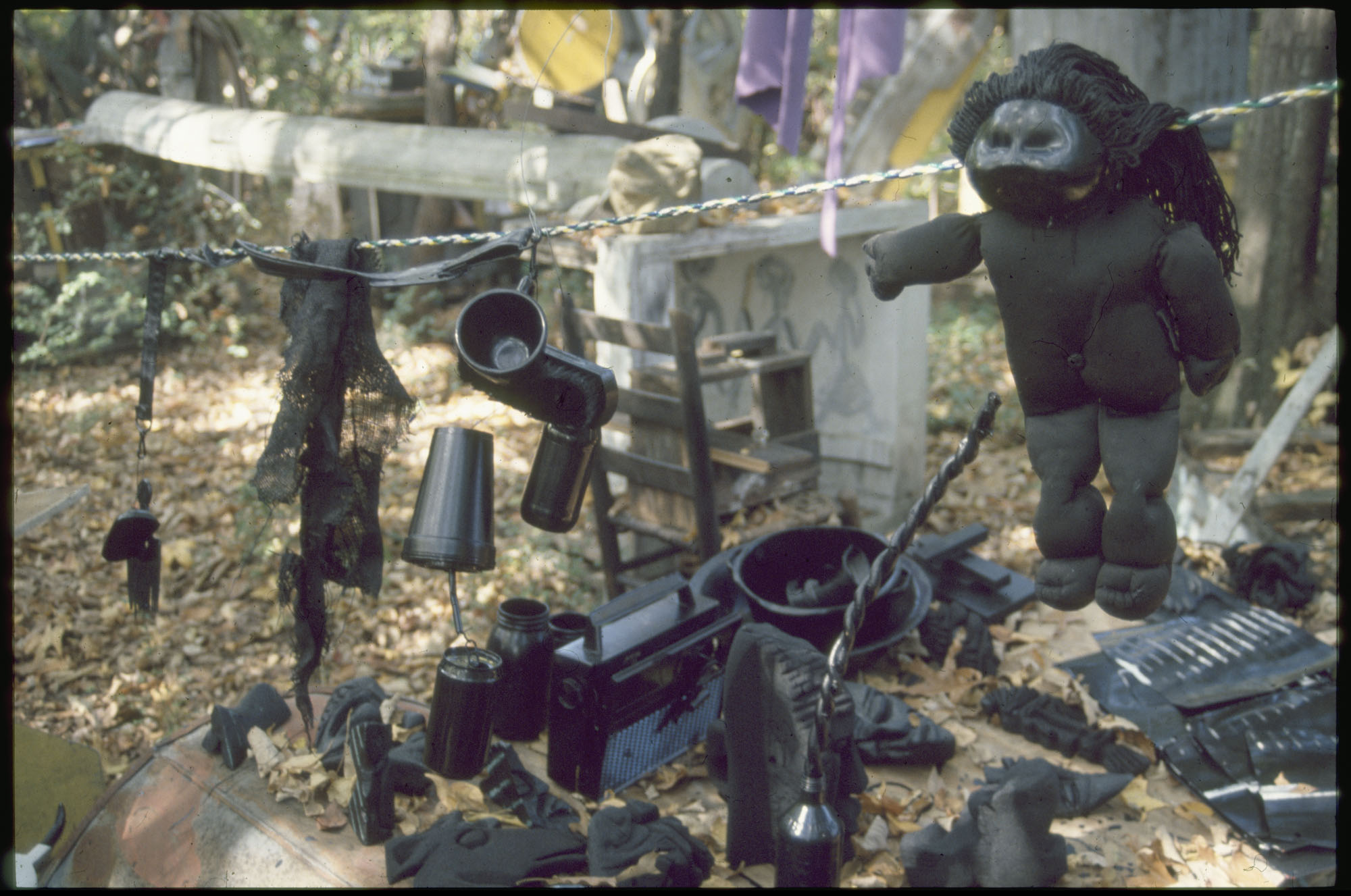 When Lonnie Holley started making art 1n 1978, he did not conceive an art environment or a yard show as such displays are often described. But over the years his prolific art output began to find a form. Over 2-acres of woodland adjoining the Birmingham Airport, Holley began arranging and re-arranging his works. He would travel looking for materials to create his works—alongside creeks, down railway lines. And selectively, he would bring these materials back to his yard. Soon, it became impossible to distinguish between art and the materials it was created from. The Environment, as it became known, was a sprawling adventure of color, texture, materials, household items, clothing, and art objects. As he says in the film—he was one of the first re-cyclers. Here are some photographs of the ever-changing Environment that would eventually be destroyed in 1997 to make way for an airport expansion that never occurred.