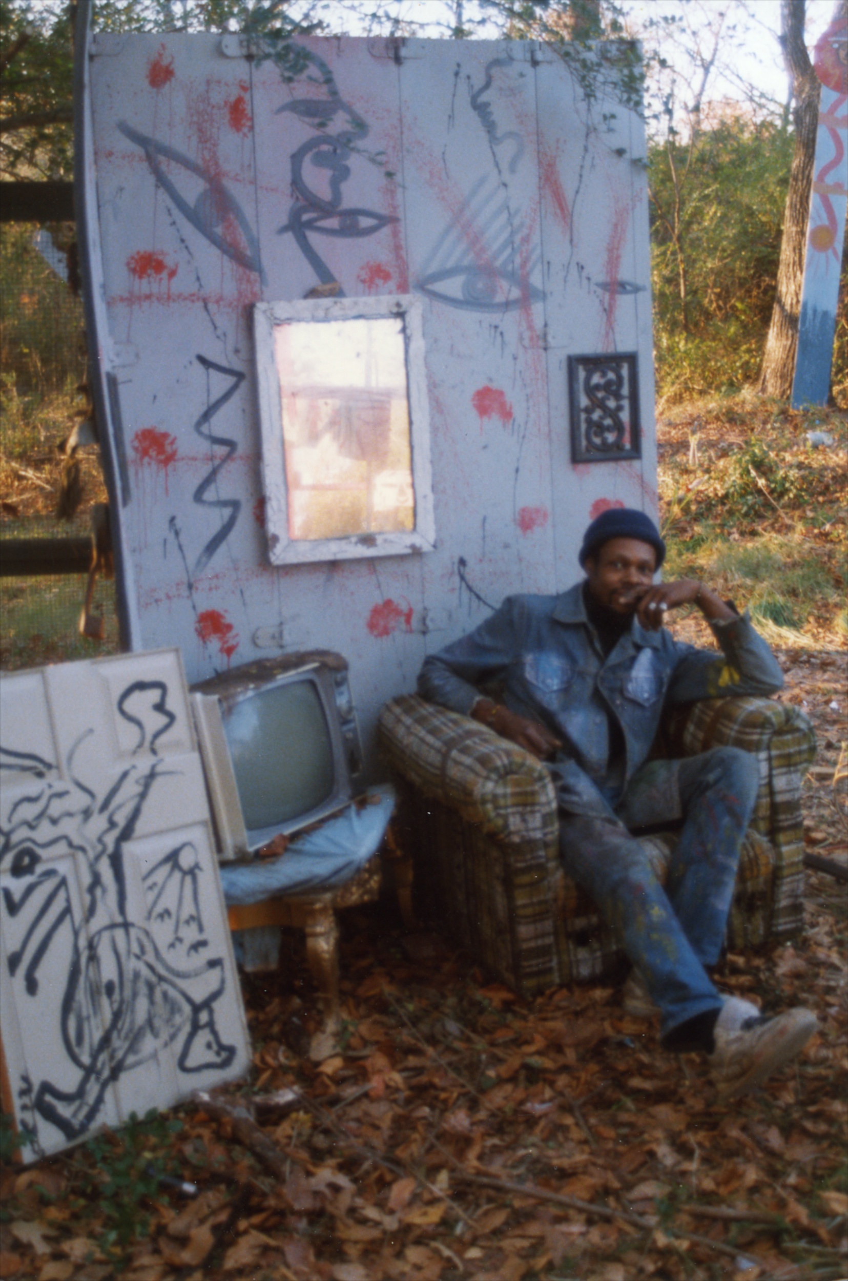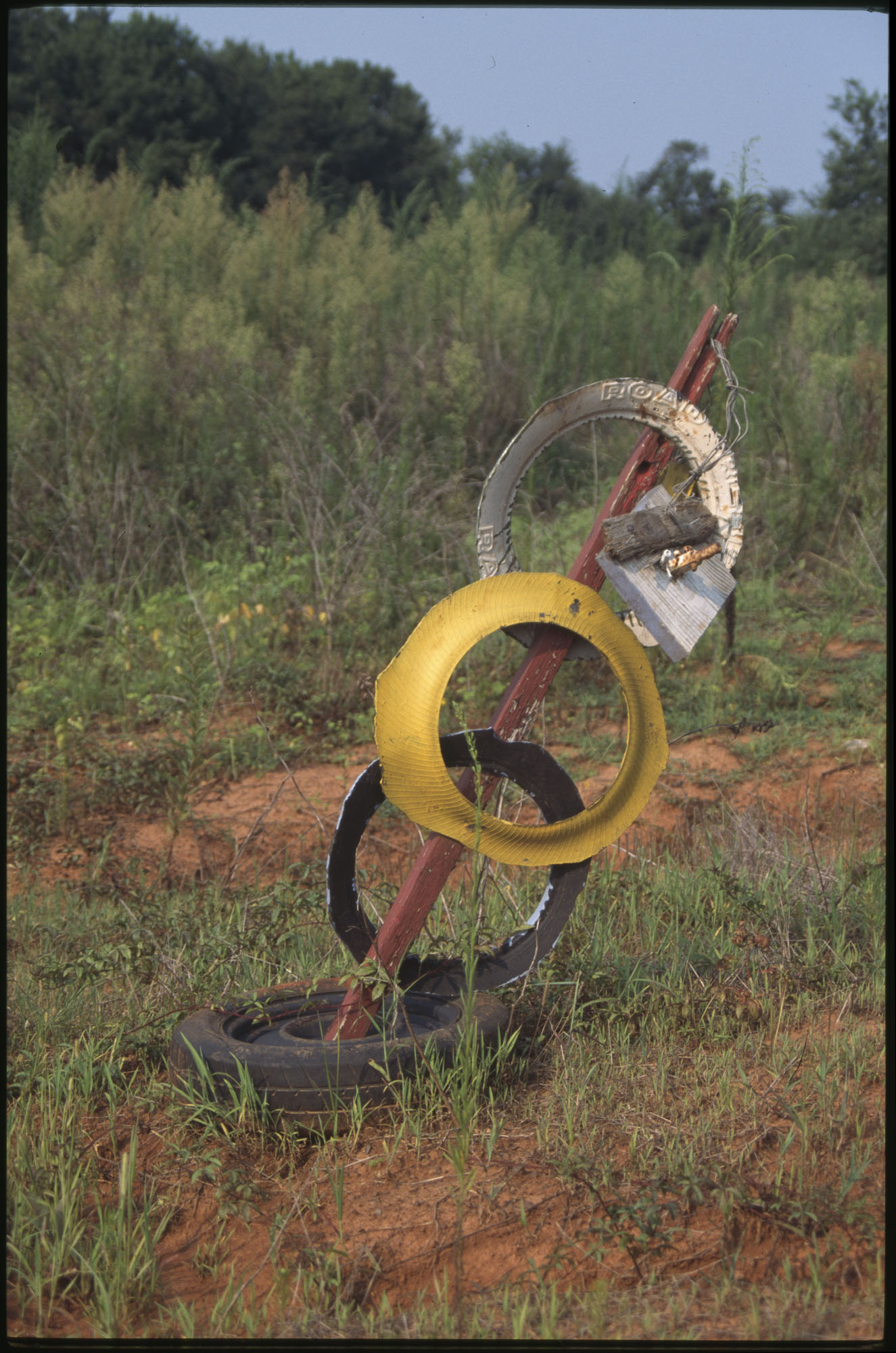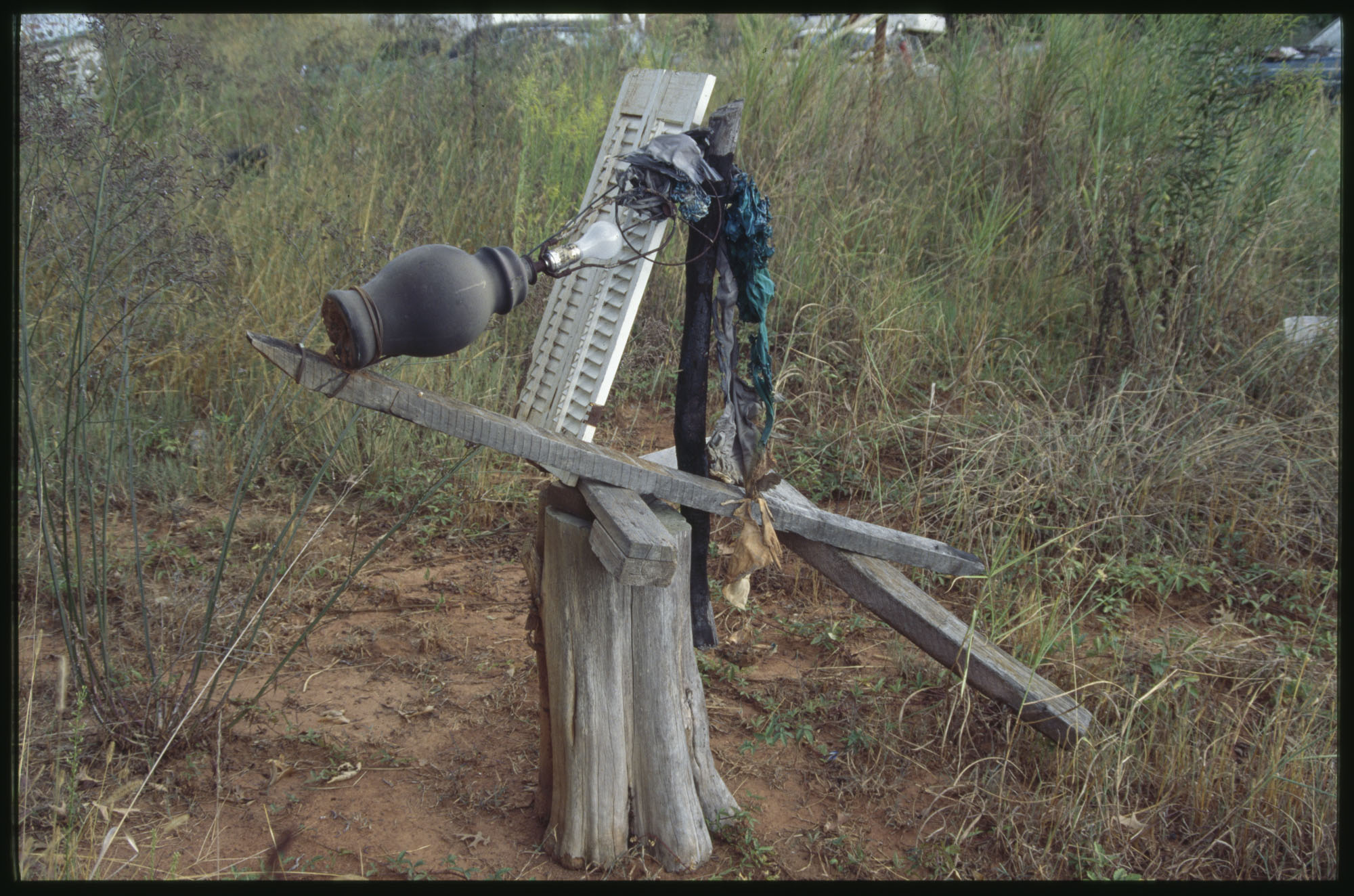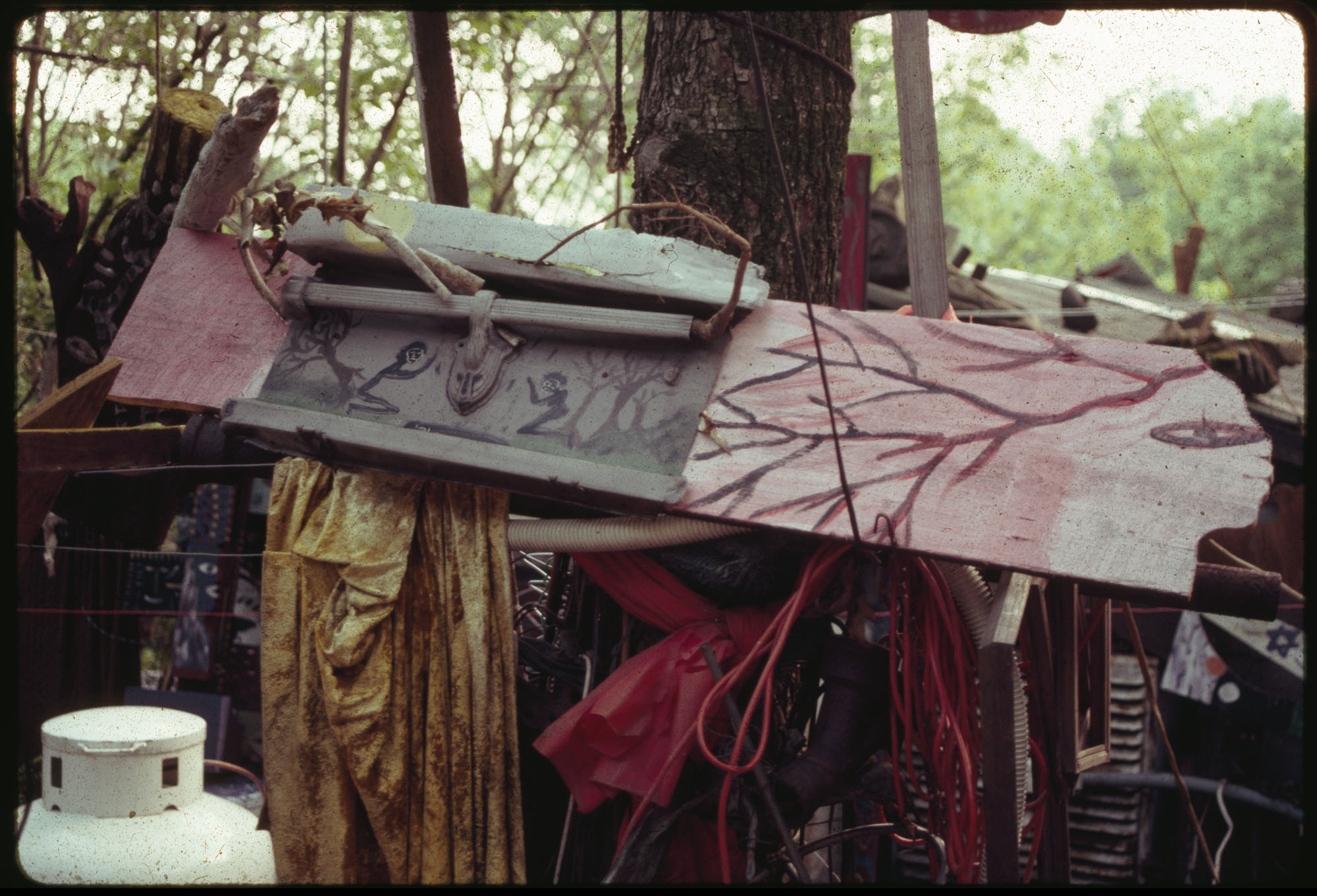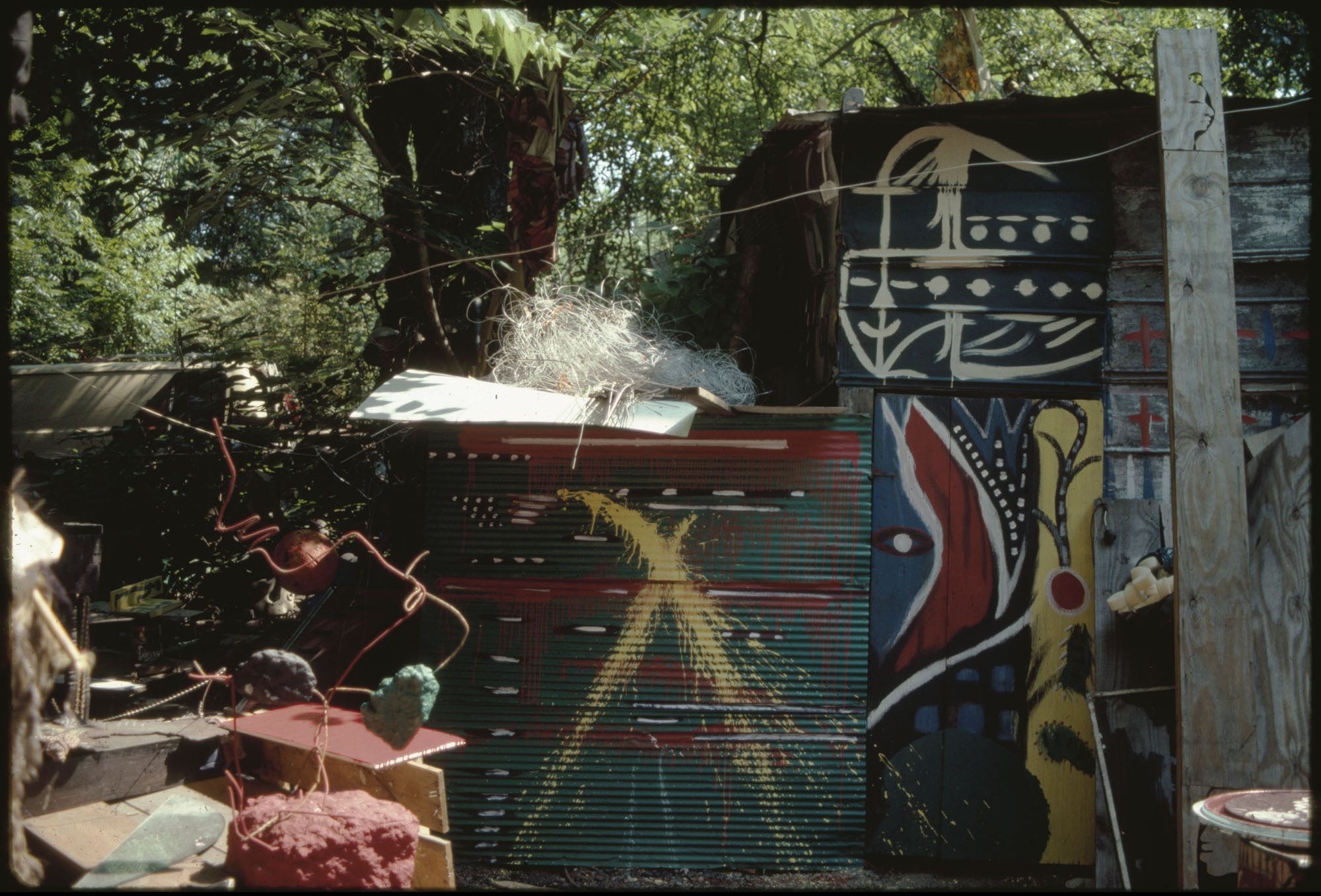 When Lonnie Holley started making art 1n 1978, he did not conceive an art environment or a yard show as such displays are often described. But over the years his prolific art output began to find a form. Over 2-acres of woodland adjoining the Birmingham Airport, Holley began arranging and re-arranging his works. He would travel looking for materials to create his works—alongside creeks, down railway lines. And selectively, he would bring these materials back to his yard. Soon, it became impossible to distinguish between art and the materials it was created from. The Environment, as it became known, was a sprawling adventure of color, texture, materials, household items, clothing, and art objects. As he says in the film—he was one of the first re-cyclers. Here are some photographs of the ever-changing Environment that would eventually be destroyed in 1997 to make way for an airport expansion that never occurred.